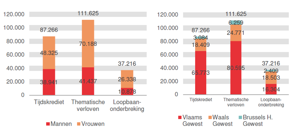 Vooral vrouwen nemen tijdskrediet, thematisch verlof of loopbaanonderbreking. In augustus 2022 ging het om 144.851 vrouwelijke uitkeringstrekkers (61,3%) tegenover 91.256 mannelijke (38,7%). Verder wordt vooral in het Vlaams Gewest gebruik gemaakt van tijdskrediet, thematische verloven en loopbaanonderbreking: in augustus 2022 gaat het om 162.672 uitkeringstrekkers (68,9%) tegenover 61.683 in het Waals en 11.752 in het Brussels Hoofdstedelijk Gewest (respectievelijk 26,1% en 5,0%).