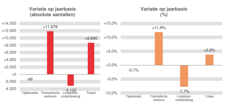 Dalingen bij het tijdskrediet en de loopbaanonderbreking, stijging bij de thematische verloven