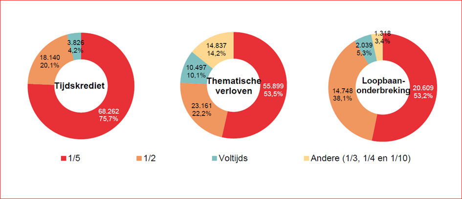 Het aantal voltijdse onderbrekingen is daarentegen vrij beperkt: het gaat om 16.362 of 7,0% van de gevallen (3.826 of 4,2% bij het tijdskrediet, 10.497 of 10,1% bij de thematische verloven en 2.039 of 5,3% bij de loopbaanonderbreking).