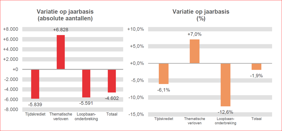 Dalingen bij het tijdskrediet en de loopbaanonderbreking, stijging bij de thematische verloven