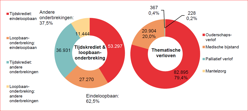 Bijna 2/3 van de uitkeringen in het kader van tijdskrediet en loopbaanonderbreking (80.567 eenheden, d.i. 62,5%) betreffen het eindeloopbaanstelsel, waarmee oudere werknemers vóór hun pensioen hun werkregime lichter maken teneinde langer tewerkgesteld te kunnen blijven. De thematische verloven betreffen voor ongeveer 4/5 het ouderschapsverlof (82.895 eenheden, d.i. 79,4%). Het thematisch verlof voor mantelzorgers, dat vanaf september 2020 in werking trad, betreft 228 eenheden.