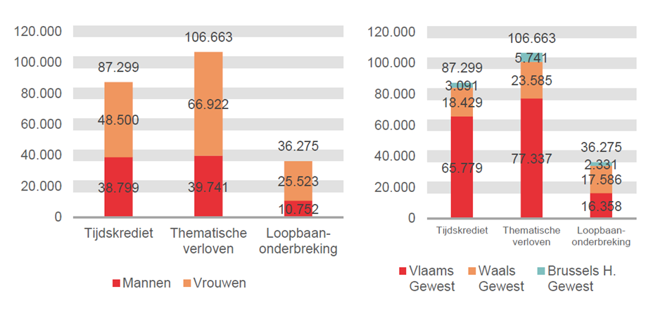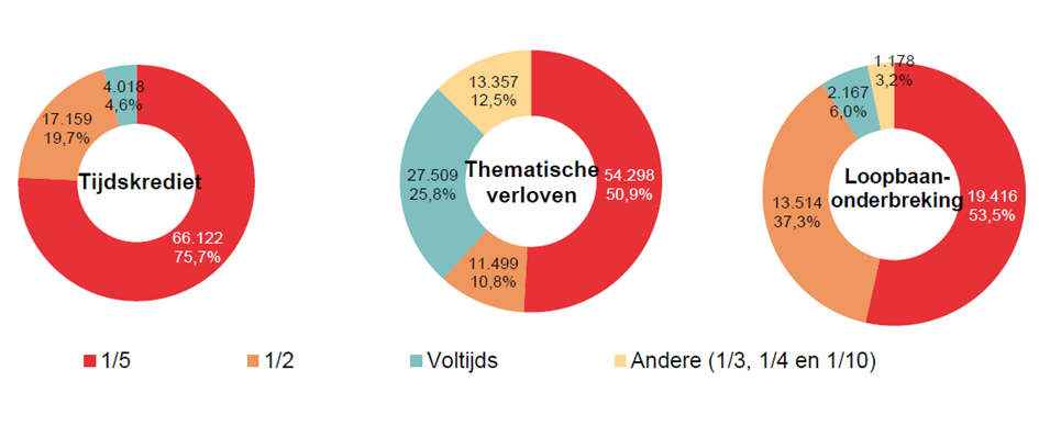 Het aantal voltijdse onderbrekingen is daarentegen vrij beperkt: het gaat om 33.694 of 14,6% van de gevallen (4.018 of 4,6% bij het tijdskrediet, 27.509 of 25,8% bij de thematische verloven en 2.167 of 6,0% bij de loopbaanonderbreking).