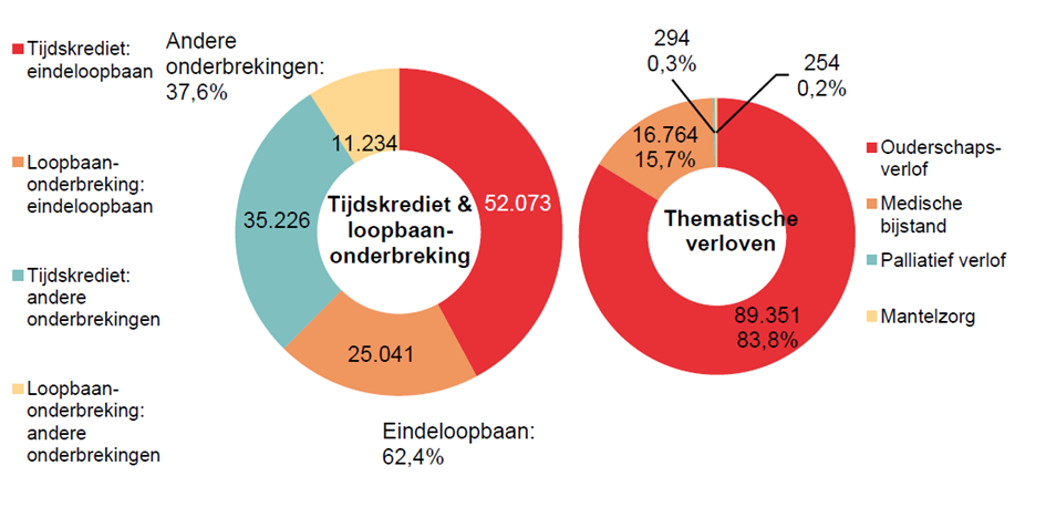 Bijna 2/3 van de uitkeringen in het kader van tijdskrediet en loopbaanonderbreking (77.114 eenheden, d.i. 62,4%) betreffen het eindeloopbaanstelsel, waarmee oudere werknemers vóór hun pensioen hun werkregime lichter maken teneinde langer tewerkgesteld te kunnen blijven. De thematische verloven betreffen voor meer dan 4/5 het ouderschapsverlof (89.351 eenheden, d.i. 83,8%). Het thematisch verlof voor mantelzorgers, dat vanaf september 2020 in werking trad, betreft 254 eenheden.