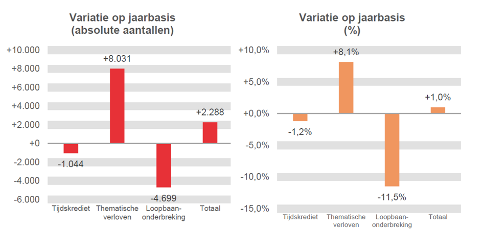 Dalingen bij het tijdskrediet en de loopbaanonderbreking, stijging bij de thematische verloven