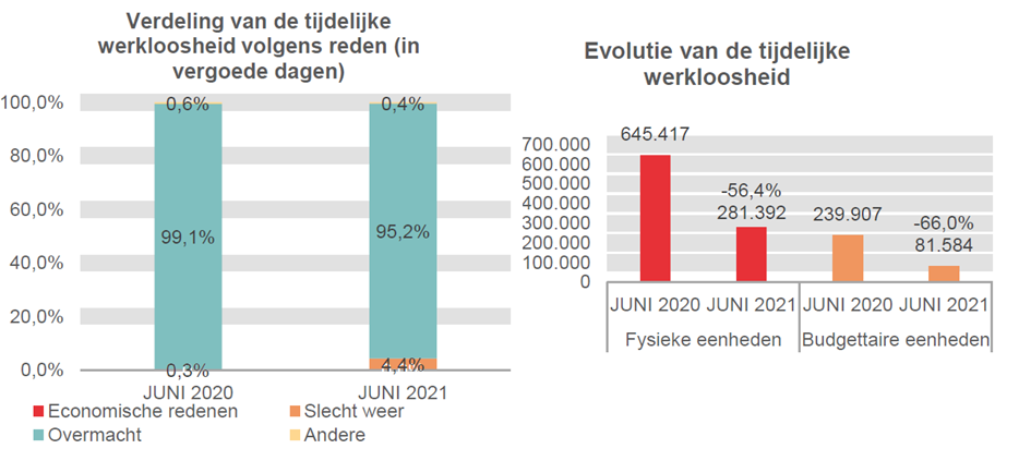 De tijdelijke werkloosheid ten slotte neemt op jaarbasis af met 364.025 eenheden of 56,4%. We brengen graag in herinnering dat in juni 2020 het aantal tijdelijk werklozen als gevolg van de pandemie nog uitzonderlijk hoog was. Het aantal werknemers in tijdelijke werkloosheid komt in juni 2021 op 281.392 fysieke eenheden, wat overeenkomt met 81.584 budgettaire eenheden rekening houdend met het beperkte aantal dagen van werkloosheid in de loop van de maand.