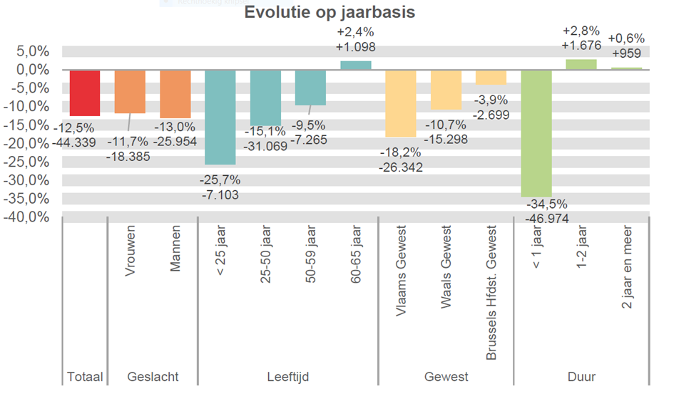 De volledige werkloosheid van korte duur (< 1 jaar) neemt af op jaarbasis met 46.974 eenheden (-34,5%), maar die van 1 tot 2 jaar stijgt: +1.676 eenheden (+2,8%). De langdurige werkloosheid (2 jaar en meer) stijgt met 959 eenheden (+0,6%).