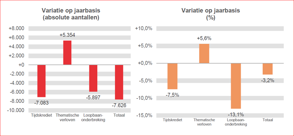 Dalingen bij het tijdskrediet en de loopbaanonderbreking, stijging bij de thematische verloven