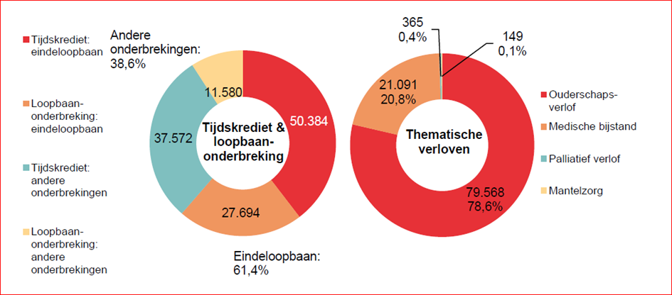 Bijna 2/3 van de uitkeringen in het kader van tijdskrediet en loopbaanonderbreking (78.078 eenheden, d.i. 61,4%) betreffen het eindeloopbaanstelsel, waarmee oudere werknemers vóór hun pensioen hun werkregime lichter maken teneinde langer tewerkgesteld te kunnen blijven. De thematische verloven betreffen voor meer dan 3/4 het ouderschapsverlof (79.568 eenheden, d.i. 78,6%). Het thematisch verlof voor mantelzorgers, dat vanaf september 2020 in werking trad, betreft 149 eenheden.