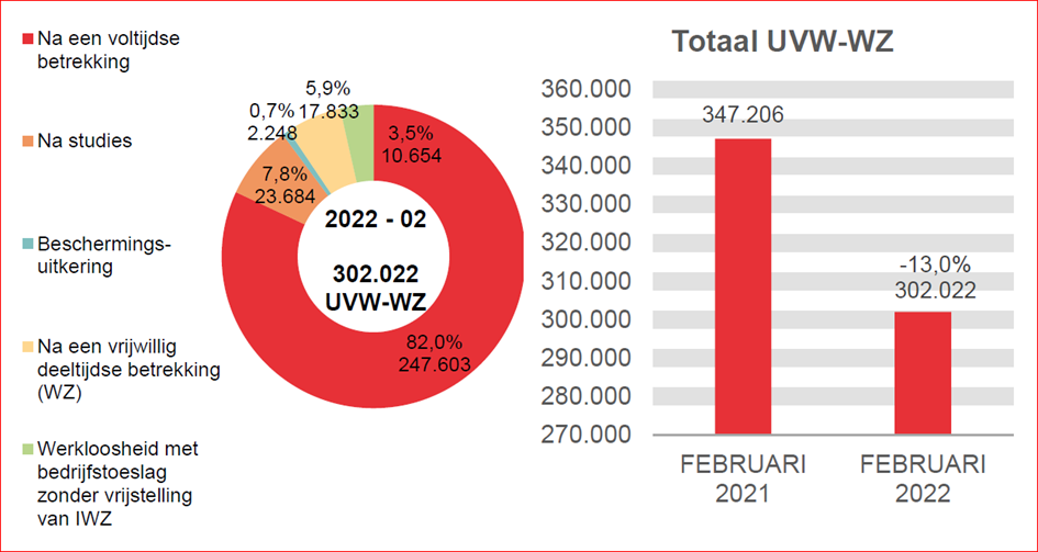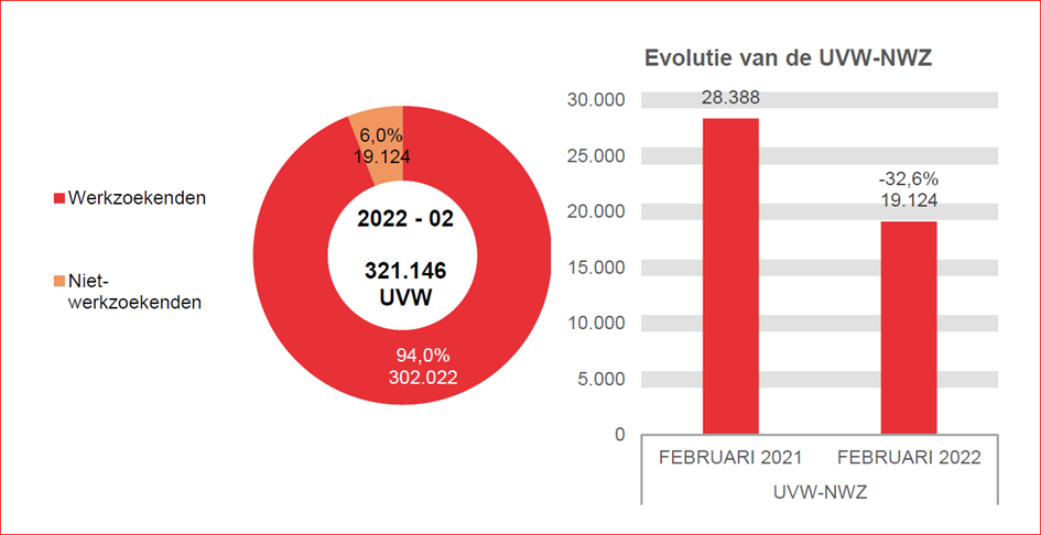 In februari 2022 hebben 302.022 werkzoekende uitkeringsgerechtigde volledig werklozen een uitkering ontvangen, d.i. 45.184 minder dan in februari 2021 (-13,0%). Die 302.022 uitkeringsgerechtigden worden als volgt verdeeld: 271.287 werkzoekende uitkeringsgerechtigde volledig werklozen toegelaten op basis van voltijdse arbeidsprestaties of toegelaten op basis van studies, 17.833 werkzoekende uitkeringsgerechtigde volledig werklozen toegelaten op basis van vrijwillig deeltijdse arbeid, 10.654 werkzoekende uitkeringsgerechtigde volledig werklozen met bedrijfstoeslag en 2.248 beschermingsuitkeringen.