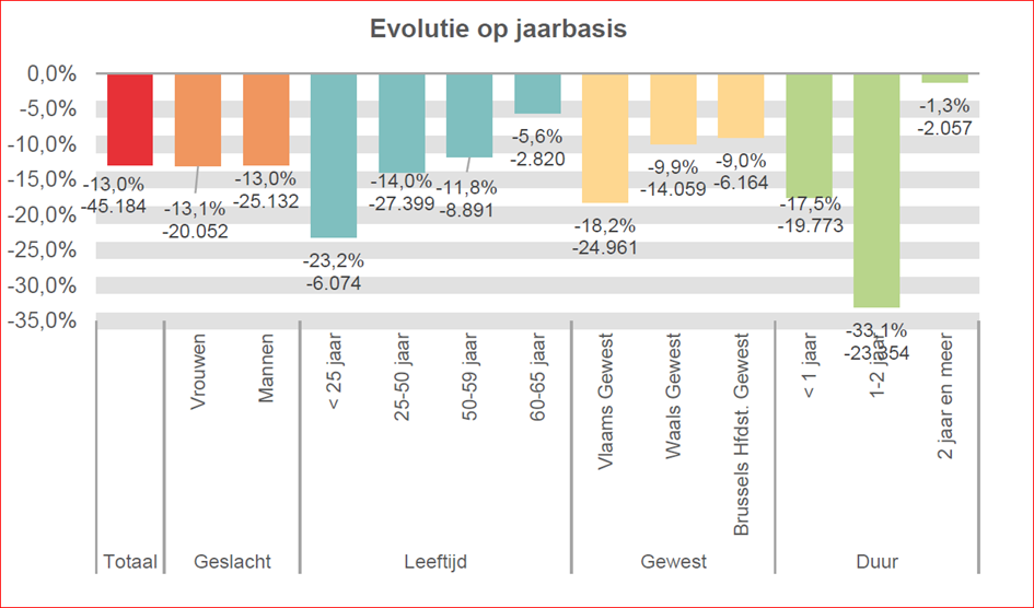 De volledige werkloosheid van korte duur (< 1 jaar) neemt af op jaarbasis met 19.773 eenheden (-17,5%), net zoals die van 1 tot 2 jaar: -23.354 eenheden (-33,1%). De langdurige werkloosheid (2 jaar en meer) daalt met 2.057 eenheden (-1,3%).