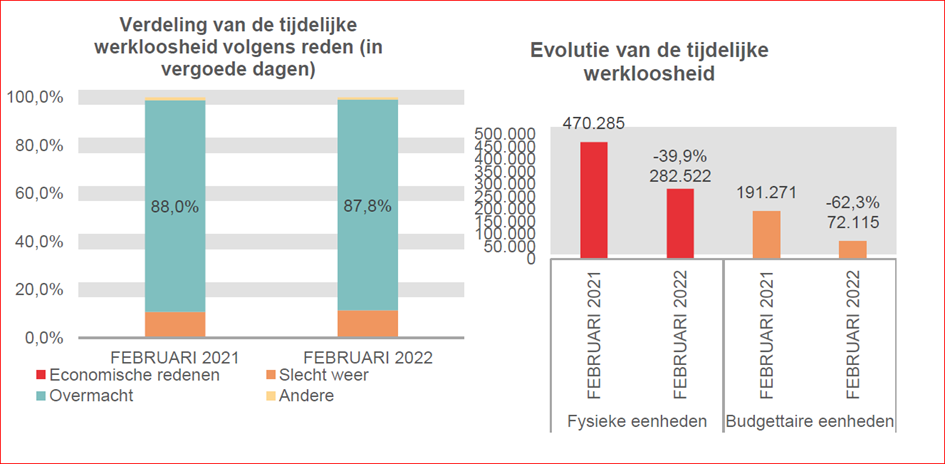 De tijdelijke werkloosheid ten slotte neemt op jaarbasis af met 187.763 eenheden of 39,9%. Het aantal werknemers in tijdelijke werkloosheid komt in februari 2022 op 282.522 fysieke eenheden, wat overeenkomt met 72.115 budgettaire eenheden rekening houdend met het beperkte aantal dagen van werkloosheid in de loop van de maand.