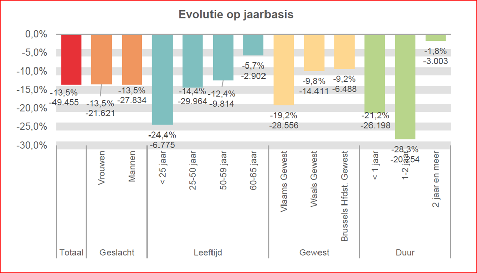 De volledige werkloosheid van korte duur (< 1 jaar) neemt af op jaarbasis met 26.198 eenheden (-21,2%), net zoals die van 1 tot 2 jaar: -20.254 eenheden (-28,3%). De langdurige werkloosheid (2 jaar en meer) daalt met 3.003 eenheden (-1,8%).