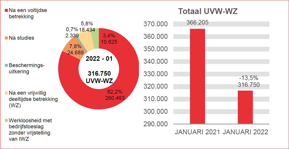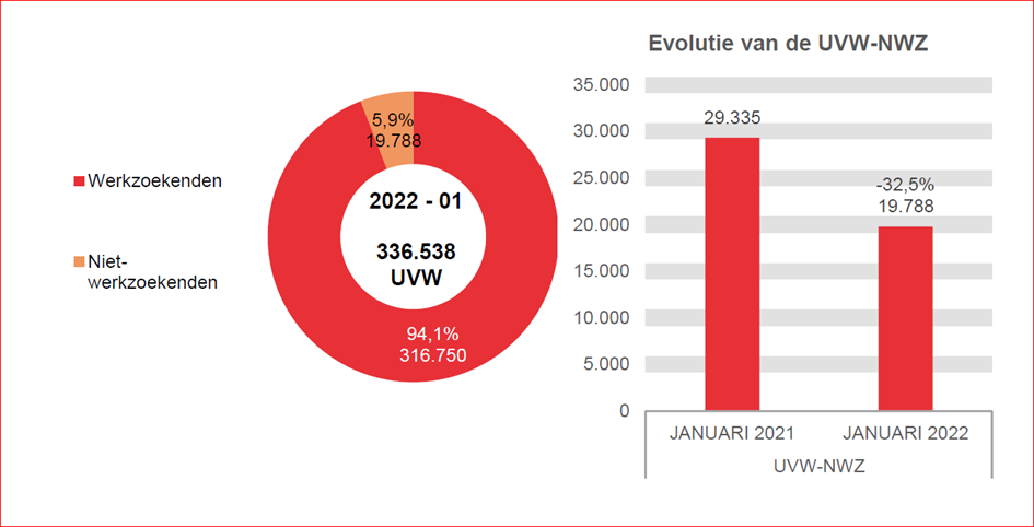 In januari 2022 hebben 316.750 werkzoekende uitkeringsgerechtigde volledig werklozen een uitkering ontvangen, d.i. 49.455 minder dan in januari 2021 (-13,5%). Die 316.750 uitkeringsgerechtigden worden als volgt verdeeld: 285.152 werkzoekende uitkeringsgerechtigde volledig werklozen toegelaten op basis van voltijdse arbeidsprestaties of toegelaten op basis van studies, 18.434 werkzoekende uitkeringsgerechtigde volledig werklozen toegelaten op basis van vrijwillig deeltijdse arbeid, 10.825 werkzoekende uitkeringsgerechtigde volledig werklozen met bedrijfstoeslag en 2.339 beschermingsuitkeringen.