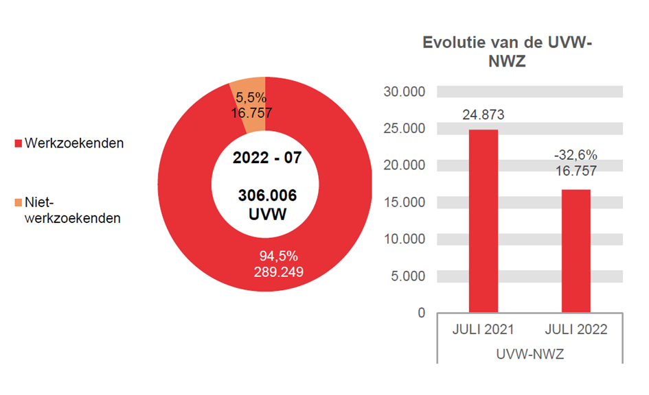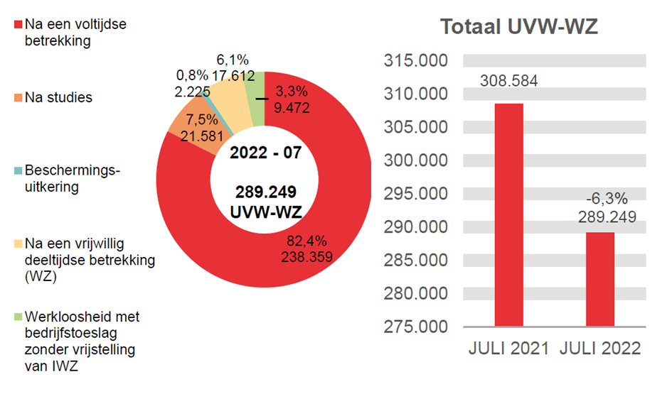 In juli 2022 hebben 289.249 werkzoekende uitkeringsgerechtigde volledig werklozen een uitkering ontvangen, d.i. 19.335 minder dan in juli 2021 (-6,3%). Die 289.249 uitkeringsgerechtigden worden als volgt verdeeld: 259.940 werkzoekende uitkeringsgerechtigde volledig werklozen toegelaten op basis van voltijdse arbeidsprestaties of toegelaten op basis van studies, 17.612 werkzoekende uitkeringsgerechtigde volledig werklozen toegelaten op basis van vrijwillig deeltijdse arbeid, 9.472 werkzoekende uitkeringsgerechtigde volledig werklozen met bedrijfstoeslag en 2.225 beschermingsuitkeringen.