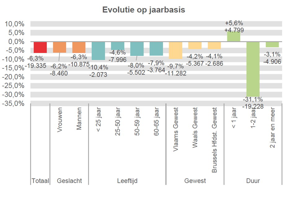 De volledige werkloosheid van korte duur (< 1 jaar) neemt toe op jaarbasis met 4.799 eenheden (+5,6%), maar die van 1 tot 2 jaar daalt: -19.228 eenheden (-31,1%). De langdurige werkloosheid (2 jaar en meer) daalt met 4.906 eenheden (-3,1%).