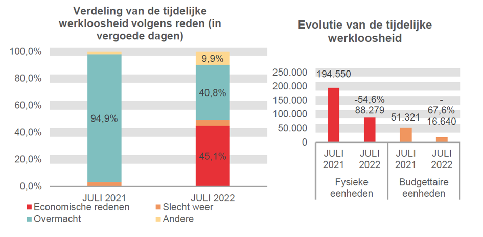 De tijdelijke werkloosheid ten slotte neemt op jaarbasis af met 106.271 eenheden of 54,6%. Vanaf 1 juli 2022 gelden opnieuw de klassieke procedures voor het invoeren van tijdelijke werkloosheid en kan dus niet langer een beroep worden gedaan op de soepele procedure tijdelijke werkloosheid overmacht die vanaf maart 2020 van toepassing was. (2) Met het aflopen van deze crisismaatregelen neemt de tijdelijke werkloosheid weer normale proporties aan. Hun aantal komt in juli 2022 op 88.279 fysieke eenheden, wat overeenkomt met 16.640 budgettaire eenheden rekening houdend met het beperkte aantal dagen van werkloosheid in de loop van de maand. Die aantallen zijn voor een zomermaand vergelijkbaar met die van het jaar 2016. Het aandeel tijdelijke werkloosheid wegens overmacht blijft echter gevoelig hoog liggen: 40,8%, waar dit aandeel voorafgaand aan de crisis steeds ruim onder de 10% bleef.