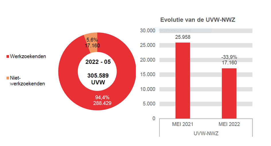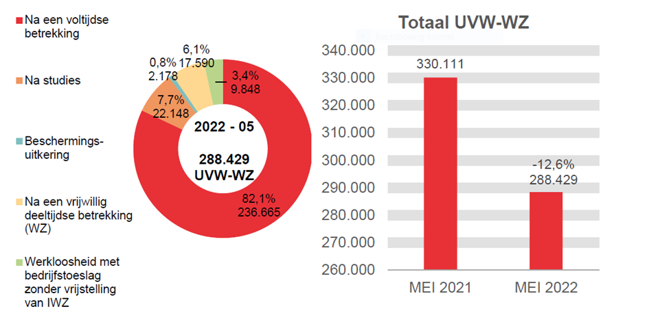 In mei 2022 hebben 288.429 werkzoekende uitkeringsgerechtigde volledig werklozen een uitkering ontvangen, d.i. 41.682 minder dan in mei 2021 (-12,6%). Die 288.429 uitkeringsgerechtigden worden als volgt verdeeld: 258.813 werkzoekende uitkeringsgerechtigde volledig werklozen toegelaten op basis van voltijdse arbeidsprestaties of toegelaten op basis van studies, 17.590 werkzoekende uitkeringsgerechtigde volledig werklozen toegelaten op basis van vrijwillig deeltijdse arbeid, 9.848 werkzoekende uitkeringsgerechtigde volledig werklozen met bedrijfstoeslag en 2.178 beschermingsuitkeringen.