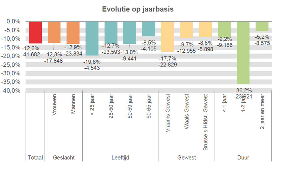 De volledige werkloosheid van korte duur (< 1 jaar) neemt af op jaarbasis met 9.186 eenheden (-9,2%), net zoals die van 1 tot 2 jaar: -23.921 eenheden (-36,2%). De langdurige werkloosheid (2 jaar en meer) daalt met 8.575 eenheden (-5,2%).