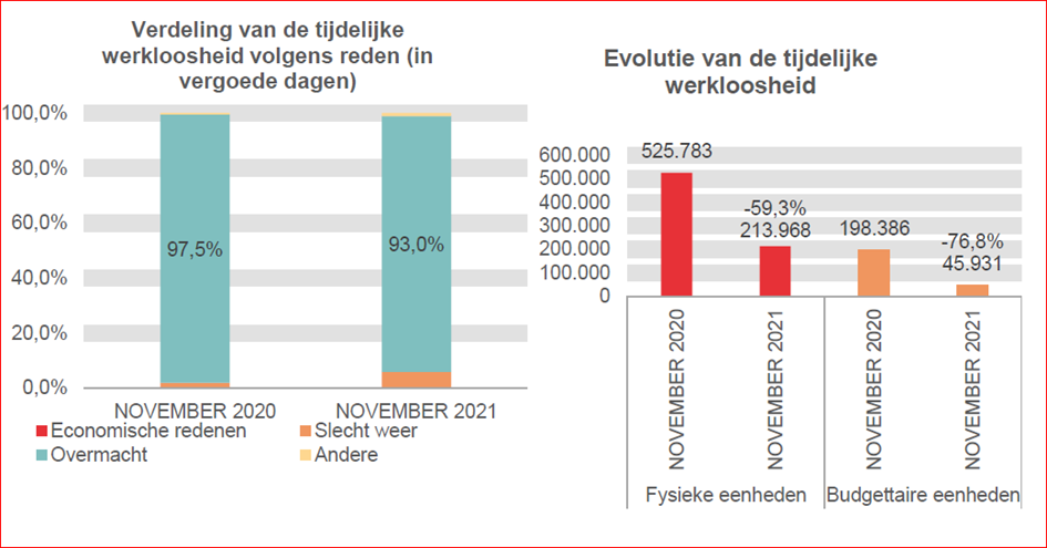 De tijdelijke werkloosheid neemt in november 2021 toe met 10,1% t.o.v. de voorgaande maand