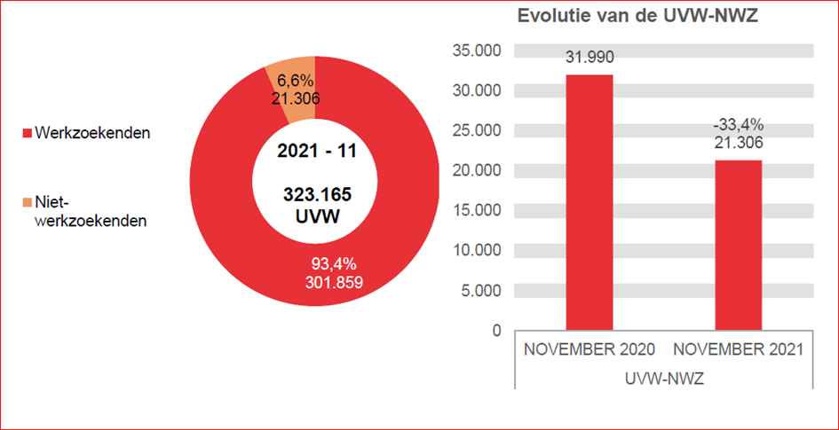 In november 2021 daalt het aantal volledig werklozen op jaarbasis met 18,0% in het Vlaams Gewest (-25.056 eenheden) en met 9,2% in het Waals Gewest (-12.637 eenheden). In het Brussels Hoofdstedelijk Gewest is er een daling van 8,2% (-5.558 eenheden). In november 2021 zijn er in het Vlaams Gewest 113.966 volledig werklozen, in het Waals Gewest 125.341 en in het Brussels Hoofdstedelijk Gewest 62.552.