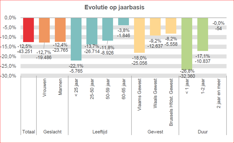 De volledige werkloosheid van korte duur (< 1 jaar) neemt af op jaarbasis met 32.360 eenheden (-26,8%), net zoals die van 1 tot 2 jaar: -10.837 eenheden (-17,1%). De langdurige werkloosheid (2 jaar en meer) daalt met 54 eenheden (-0,0%).