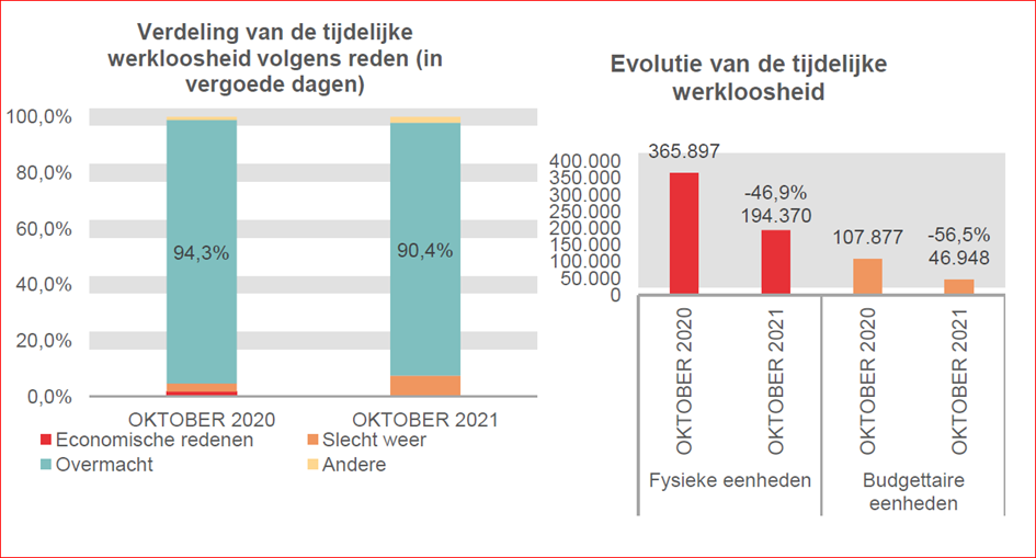 De tijdelijke werkloosheid ten slotte neemt op jaarbasis af met 171.527 eenheden of 46,9%. Het aantal werknemers in tijdelijke werkloosheid komt in oktober 2021 op 194.370 fysieke eenheden, wat overeenkomt met 46.948 budgettaire eenheden rekening houdend met het beperkte aantal dagen van werkloosheid in de loop van de maand