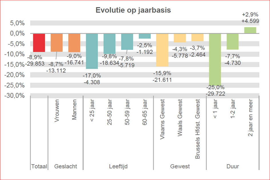 De volledige werkloosheid van korte duur (< 1 jaar) neemt af op jaarbasis met 29.722 eenheden (-25,0%), net zoals die van 1 tot 2 jaar: -4.730 eenheden (-7,7%). De langdurige werkloosheid (2 jaar en meer) stijgt met 4.599 eenheden (+2,9%).