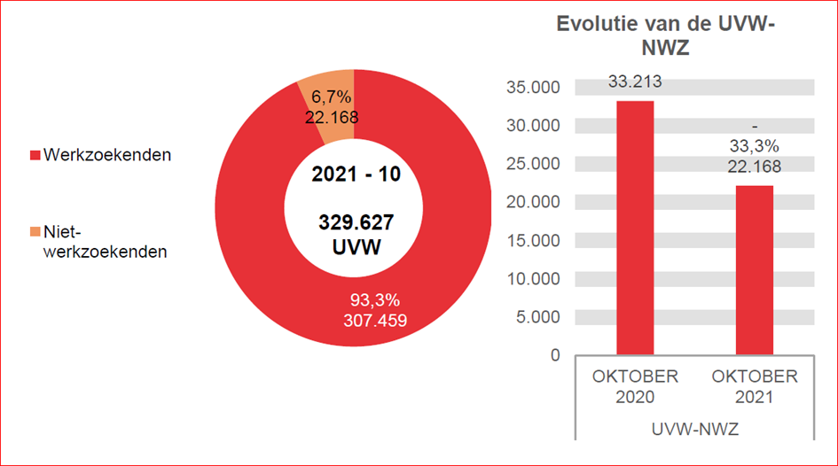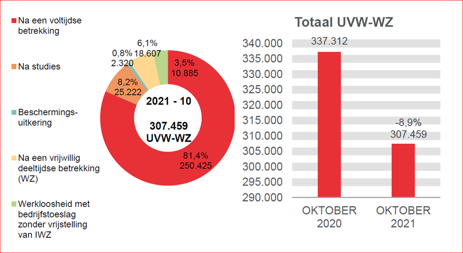 In oktober 2021 hebben 307.459 werkzoekende uitkeringsgerechtigde volledig werklozen een uitkering ontvangen, d.i. 29.853 minder dan in oktober 2020 (-8,9%). Die 307.459 uitkeringsgerechtigden worden als volgt verdeeld: 275.647 werkzoekende uitkeringsgerechtigde volledig werklozen toegelaten op basis van voltijdse arbeidsprestaties of toegelaten op basis van studies, 18.607 werkzoekende uitkeringsgerechtigde volledig werklozen toegelaten op basis van vrijwillig deeltijdse arbeid, 10.885 werkzoekende uitkeringsgerechtigde volledig werklozen met bedrijfstoeslag en 2.320 beschermingsuitkeringen (nieuw stelsel vanaf oktober 2020).
