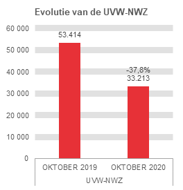 De tijdelijke werkloosheid als gevolg van het CORONAVIRUS neemt in oktober 2020 toe met 53,7% t.o.v. de voorgaande maand.