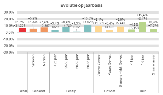 De volledige werkloosheid van korte duur (< 1 jaar) neemt toe op jaarbasis met 5.153 eenheden (+4,5%), net zoals die van 1 tot 2 jaar: +8.174 eenheden (+15,4%). De langdurige werkloosheid (2 jaar en meer) stijgt met 7.874 eenheden (+5,3%).