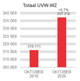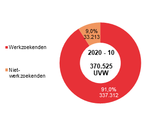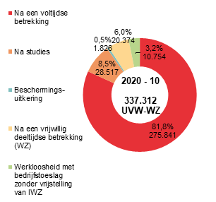 In oktober 2020 hebben 337.312 werkzoekende uitkeringsgerechtigde volledig werklozen een uitkering ontvangen, d.i. 21.201 meer dan in oktober 2019 (+6,7%). Die 337.312 uitkeringsgerechtigden worden als volgt verdeeld: 304.358 werkzoekende uitkeringsgerechtigde volledig werklozen toegelaten op basis van voltijdse arbeidsprestaties of toegelaten op basis van studies, 20.374 werkzoekende uitkeringsgerechtigde volledig werklozen toegelaten op basis van vrijwillig deeltijdse arbeid, 10.754 werkzoekende uitkeringsgerechtigde volledig werklozen met bedrijfstoeslag en 1.826 beschermingsuitkeringen (nieuw stelsel vanaf oktober 2020).