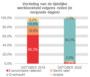 Vermits tijdelijke werkloosheid in het kader van de coronacrisis (periode maart tot december) enkel betrekking heeft op overmacht (met uitzondering van de maand september toen ook economische redenen ‘corona’ werden erkend), bedraagt het aandeel van tijdelijke werkloosheid wegens overmacht in oktober 2020 bijna 95%.