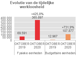 De tijdelijke werkloosheid neemt op jaarbasis toe met 296.306 eenheden of 425,8%, maar is sterk afgenomen sedert het begin van de coronacrisis, toen we meer dan 1,2 miljoen fysieke eenheden telden. Het aantal werknemers in tijdelijke werkloosheid komt in oktober 2020 op 365.897 fysieke eenheden, wat overeenkomt met 107.877 budgettaire eenheden rekening houdend met het beperkte aantal dagen van werkloosheid in de loop van de maand.