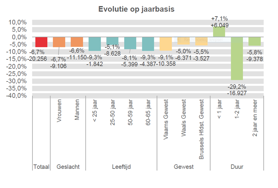De volledige werkloosheid van korte duur (< 1 jaar) neemt toe op jaarbasis met 6.049 eenheden (+7,1%), maar die van 1 tot 2 jaar daalt: -16.927 eenheden (-29,2%). De langdurige werkloosheid (2 jaar en meer) daalt met 9.378 eenheden (-5,8%).