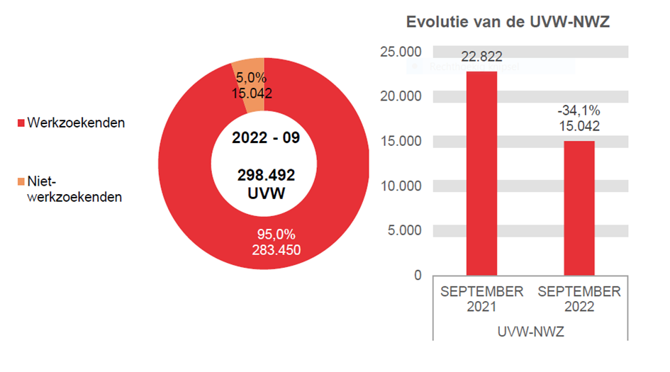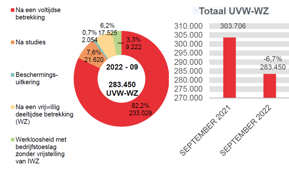 In september 2022 hebben 283.450 werkzoekende uitkeringsgerechtigde volledig werklozen een uitkering ontvangen, d.i. 20.256 minder dan in september 2021 (-6,7%). Die 283.450 uitkeringsgerechtigden worden als volgt verdeeld: 254.649 werkzoekende uitkeringsgerechtigde volledig werklozen toegelaten op basis van voltijdse arbeidsprestaties of toegelaten op basis van studies, 17.525 werkzoekende uitkeringsgerechtigde volledig werklozen toegelaten op basis van vrijwillig deeltijdse arbeid, 9.222 werkzoekende uitkeringsgerechtigde volledig werklozen met bedrijfstoeslag en 2.054 beschermingsuitkeringen.