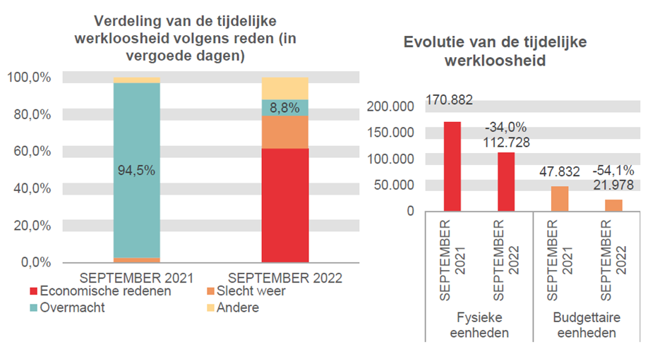 De tijdelijke werkloosheid ten slotte neemt op jaarbasis af met 58.154 eenheden of 34,0%. Het aantal werknemers in tijdelijke werkloosheid komt in september 2022 op 112.728 fysieke eenheden, wat overeenkomt met 21.978 budgettaire eenheden rekening houdend met het beperkte aantal dagen van werkloosheid in de loop van de maand.
