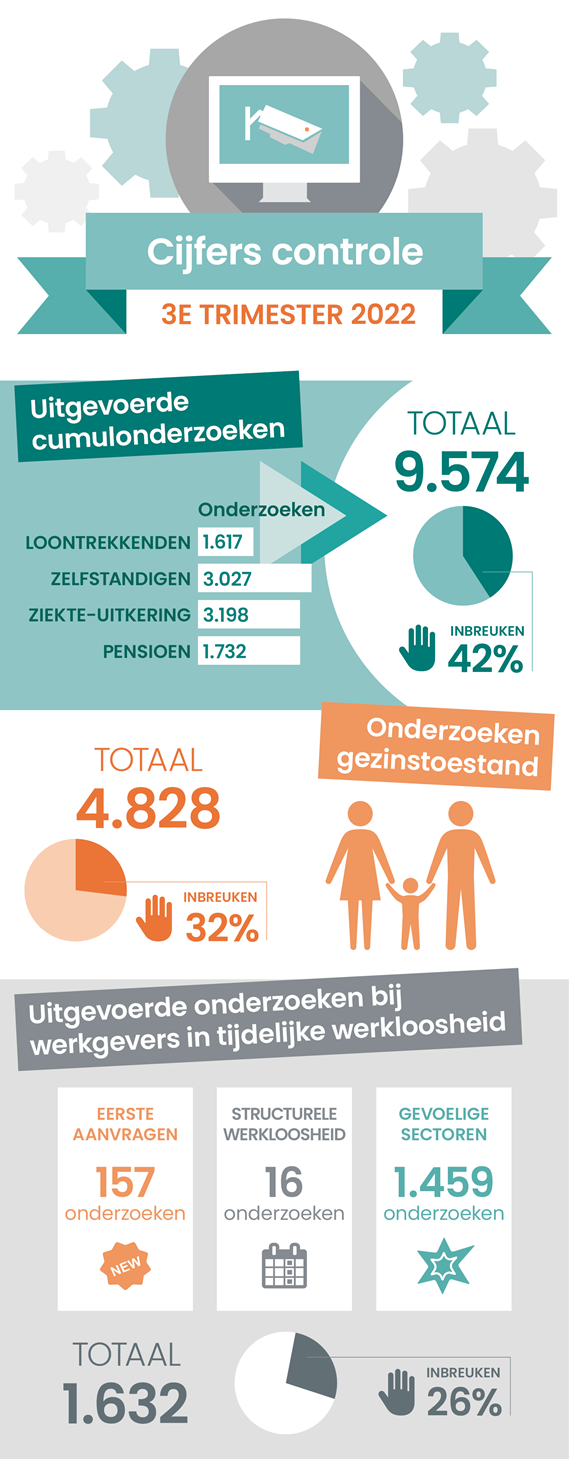 Tijdens het deerde trimester van 2022 werden 9.574 controles uitgevoerd: controles op cumul van werkloosheidsuitkeringen met ziekte-uitkeringen (3.198) of pensioen (1.732), maar ook op cumul van werkloosheidsuitkeringen met inkomsten uit professionele activiteiten als loontrekkende (1.617) of als zelfstandige (3.027).