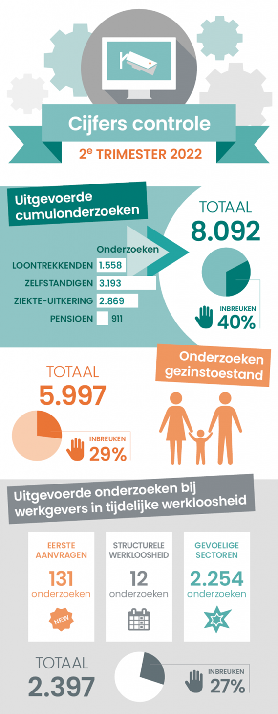 Tijdens het tweede trimester van 2022 werden 8.092 controles uitgevoerd: controles op cumul van werkloosheidsuitkeringen met ziekte-uitkeringen (2.869) of pensioen (472), maar ook op cumul van werkloosheidsuitkeringen met inkomsten uit professionele activiteiten als loontrekkende (1.558) of als zelfstandige (3.193).