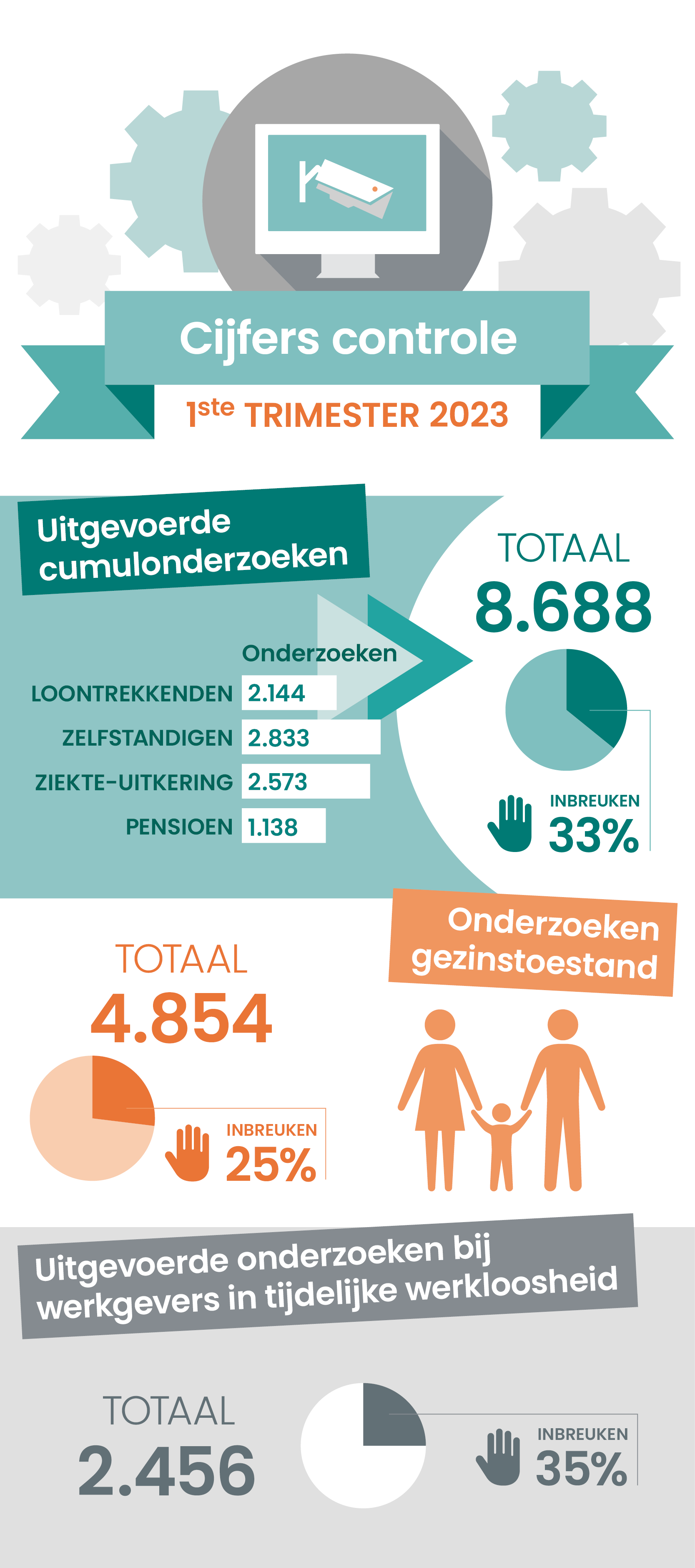 Tijdens het eerste trimester van 2023 werden 8.688 controles uitgevoerd: controles op cumul van werkloosheidsuitkeringen met ziekte-uitkeringen (2.573) of pensioen (1.138), maar ook op cumul van werkloosheidsuitkeringen met inkomsten uit professionele activiteiten als loontrekkende (2.144) of als zelfstandige (2.833).