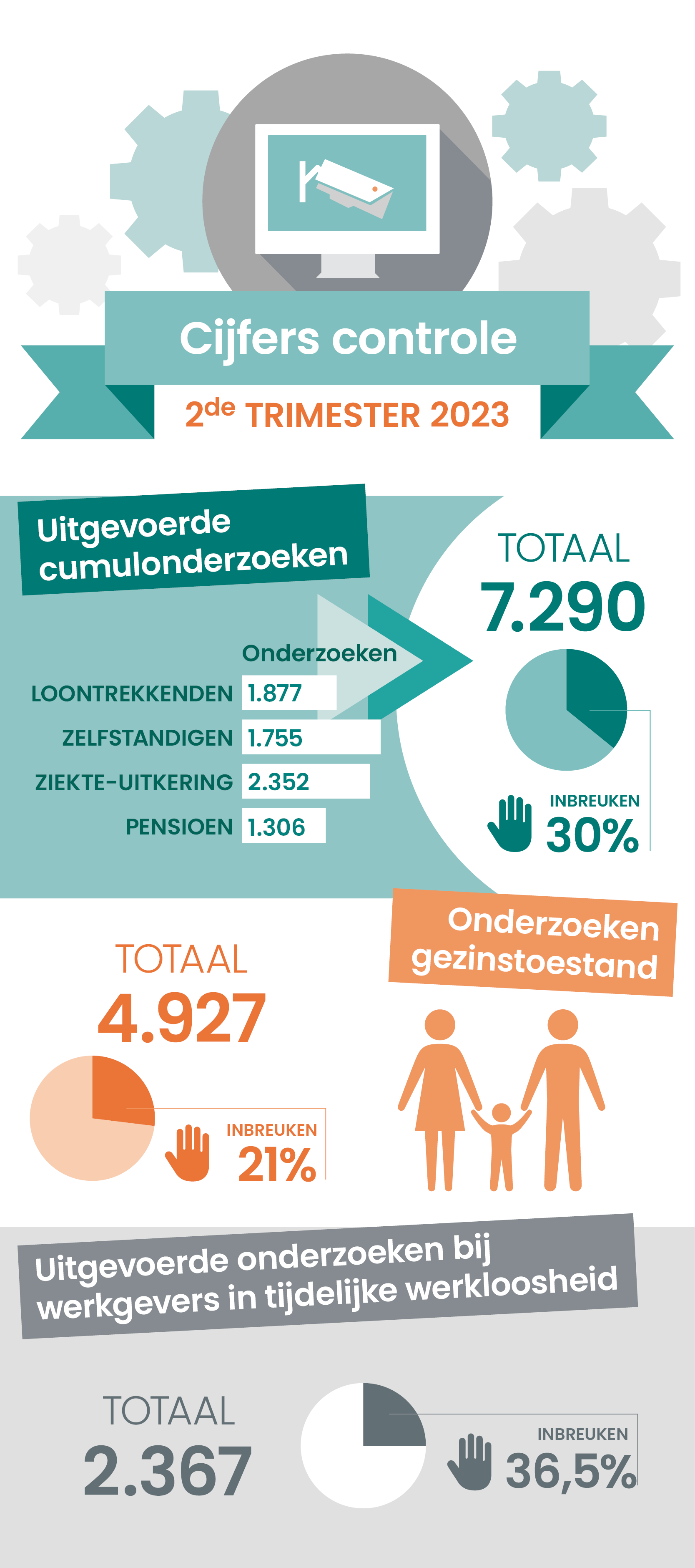 Tijdens het tweede trimester van 2023 werden 7.290 controles uitgevoerd: controles op cumul van werkloosheidsuitkeringen met ziekte-uitkeringen (2.352) of pensioen (1.306), maar ook op cumul van werkloosheidsuitkeringen met inkomsten uit professionele activiteiten als loontrekkende (1.877) of als zelfstandige (1.755).